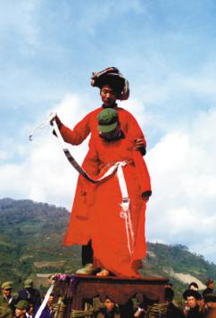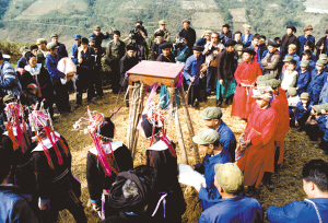 受戒仪式前前后后要举行好几天,一般依照受戒者家的经济条件来定。时间短的叫“小办”,时间长的称“大办”。但其中有一条,不论时间长短,度戒中的规矩是不能违背的。这次十几位受戒者合起来办的度戒,听说是七天七夜的“大办”。在这几天中,受戒者必须严禁会客、社交、唱歌等,只能低头修身养性,吃清淡无油的饭和水。度戒中最重要的一件事是聘请师父,有“度师”和“度道”之分,师傅自然有“师公”和“道公” 之分。师宗县蓝靛瑶中的度师为武戒,师公要负责“五台” 受戒仪式。度道为文戒,道公身穿红色法衣,负责念经求神等仪式。受戒祭师一般由德高望重的长者担任,他们是寨中一切主要事务的决策者,也是寨中最有学问的人。在受戒仪式中,他们要对弟子进行族史、族规、社会道德等多方面的教育。