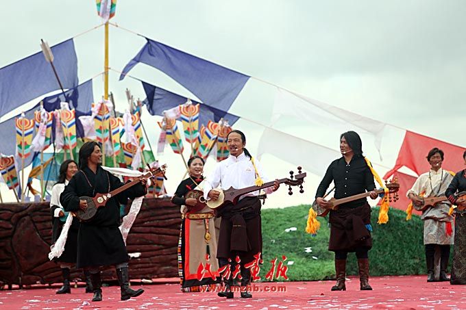 开幕式后,举行了具有藏民族特色的文艺表演。图为玛曲县民间弹唱艺人联唱《岭·圣地》