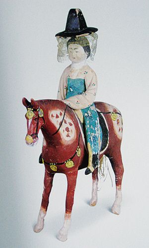 吐鲁番市阿斯塔那唐墓出土的彩绘泥塑戴帷帽骑马仕女俑