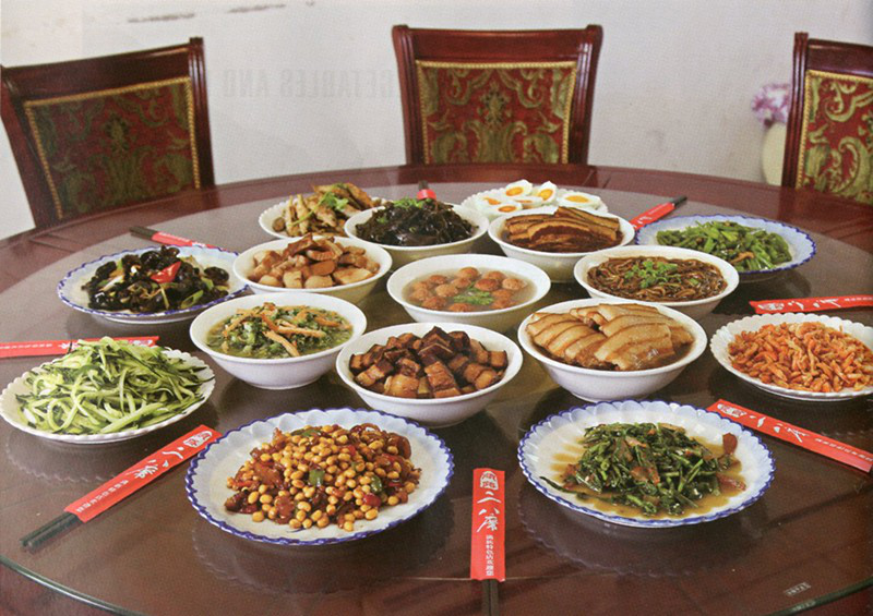 “二八席,八个盘、八个碗,八盘凉菜、八碗热菜,讲究荤素搭配,凉菜以时令蔬菜为主,可随季节自由搭配,热菜相对固定,即为红木梳背和白木梳背、红剪子和白剪子。”李凤友像说顺口溜一样道出了二八席的基本构成。