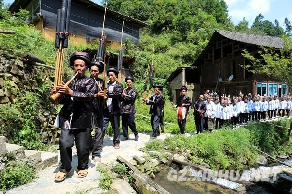 宰荡侗寨 侗族同胞吹芦笙引领前来吃相思的客人进寨。(杨成利 摄)