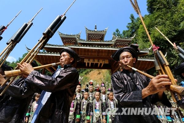 宰荡侗寨 侗族同胞吹芦笙迎接前来吃相思的客人。(杨成利 摄)