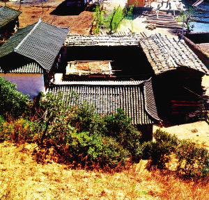 纳西族的民居在民国时期普遍呈“用圆木纵横相架,层面高至七、八尺,即加椽行,覆之以板,石压其上”的“木...
