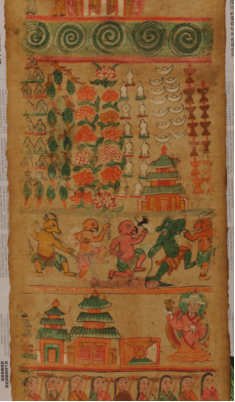 纳西族东巴教的长幅布卷画,通称为“神路图”,它是东巴教绘画中的巨作。此类画一般长10-20米,宽1尺...