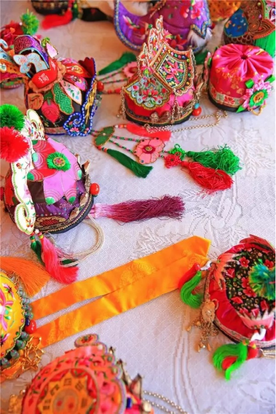 走进杨文焕的工作室,犹如进入一个明媚鲜艳的梦境。首先映入眼帘的,便是那一顶顶色彩鲜艳、绣工精致的童帽:造型大方、线条流畅的狮子帽;色彩明艳、虎虎生威的老虎帽;精巧别致、活泼可爱的翘尾帽;高雅富丽、古韵悠长的公子帽;别具一格、特色鲜明的牌坊帽。
