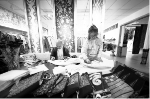 图为蜡染非遗工坊的设计师们正在设计蜡染产品。