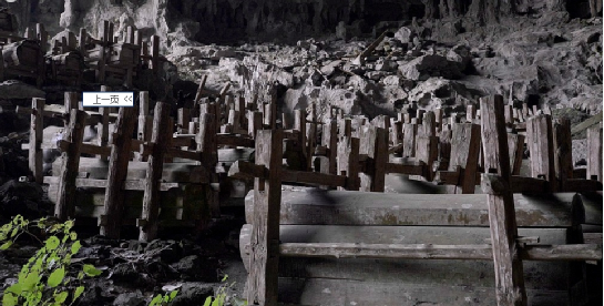 果里岩洞葬位于贵州龙里县摆省乡果里村东1公里煤洞坡的洞穴中,地处岩溶山原,峰丛林立,乔灌间杂。该洞在山顶下四十米处呈南北向横穿山体,长580米,宽为38—65米,高为21—50米,有两个入口;北面入口,宽54米,高21米,;南面入口,宽35米,高45米,有三道石砌墙垣。洞中地势内斜平缓,洞内干燥,能见度好,入口处地势外斜。据查,果里的苗族于明朝初期从贵阳迁徙而来。从迁徙之初至清末,他们均习惯将亡者殓于棺木集中存放在洞穴之内。在洞穴北面入口3000平方米的范围内现存完好的棺木有192具,腐朽散落及其它原因损毁的约200余具。棺木材质为杉木。棺木有平板平头和鼓型雄头之分,其大小因亡者的体型而定。平板平头型棺木制作粗糙,长1.45—2.23米,宽0.46—0.75米,高0.46——0.9米;鼓型雄头棺木多为杉木本色,长1.5—2.23米,宽0.48—0.8米,高0.5—0.9米。棺木一律头向北面入口,均固定于两个或三个“井”字架上;三个“井”字架表明亡者为男性,两个“井”字架的为女性。棺内亡者头靠凹型木枕。平板平头棺为明代,鼓型雄头棺为清代。