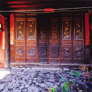 云南大理市绿桃村“三坊一照壁”民居堂屋六扇木门的雕刻。院内厦廊和正房的格子门,一般由6扇组成,每扇门又分隔成5块木板,每块木板都是透雕和浮雕相结合的木雕。分别雕刻着“双凤朝阳、二龙抢宝、八仙过海、喜鹊登梅、渔樵耕读、六合同春”的吉祥图案,刀法娴熟,轮廓清晰,形象生动,一个院落就是一个木雕艺术画廊。此外,窗上有通透的花格,下部槛墙做成木质裙板。