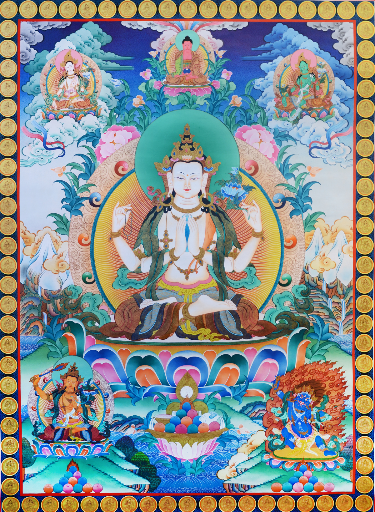 四臂观音是雪域西藏的守护神,藏人由老至幼家家户户,皆吟诵其六字大明咒:“嗡嘛呢叭咪吽”。四臂观音舆文殊菩萨、金刚手菩萨,合称三族姓尊.代表大悲、大智、大力,为密乘行者人人必修的法门。