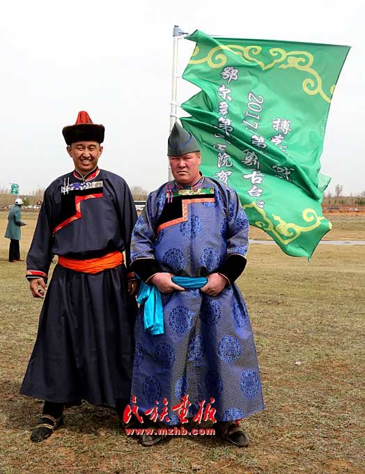 巴音昌呼格草原举行。图为被授予“将嘎”(彩带)的鄂尔多斯搏克们