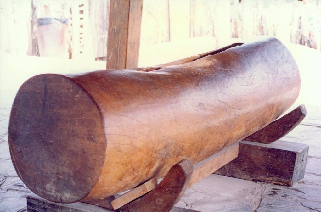 过去,佤族凡新建一个村寨,就要先找水源定寨址,再拉木鼓盖木鼓房。佤族认为木鼓是天神莫伟的床,木鼓房是莫伟的家,只有拉了木鼓,请莫伟天神进寨保佑、才能建房立寨,拉木鼓的日子一般在佤历一月,即公历10月进行。是时,先由寨子派出有经验的老人3—5人进山选择树木,将选定的树木每棵劈一点树皮回来,由魔巴杀鸡卜卦,哪棵的卦好就确定为做木鼓的树,而后由魔巴率领青壮年男子进山将树砍倒,断出一截做木鼓用。全寨男女老少盛装艳服将木头拉回,凿成木鼓,安放于鼓房内。拉木鼓的场面极为热闹壮观,人们以能摸一下拉木鼓的绳索为最大的荣耀。木头拉到寨外要举行隆重的剽牛祭神仪式才能将木头拉进寨内。木鼓有公母之分,公木鼓用红毛树,母木鼓用麻公树。鼓长1.5-2米,鼓身直径70—100厘米,一般是扁形和方形。洞深40-50厘米,洞口宽4-5厘米,长1.2-1.4米。洞呈瓜瓢形。背端多有牛头形浮雕。由于所用本质不同,公木鼓发音高亢清亮,母木鼓沉浑悠扬,响声遥远。过去,只有逢村寨大事或械斗或集会议事,或祭祀鬼神,或告急友邻才能敲响木鼓,平时是不能随便敲的。由于佤族历史上有猎人头祭祀木鼓的习俗,村寨部落间经常发生血族复仇的械斗。随着猎头陋习的革除,木鼓已从原始祟拜的氛围中摆脱出来,成了人们喜爱的敲击乐器,佤族编创了自娱自乐的木鼓舞。