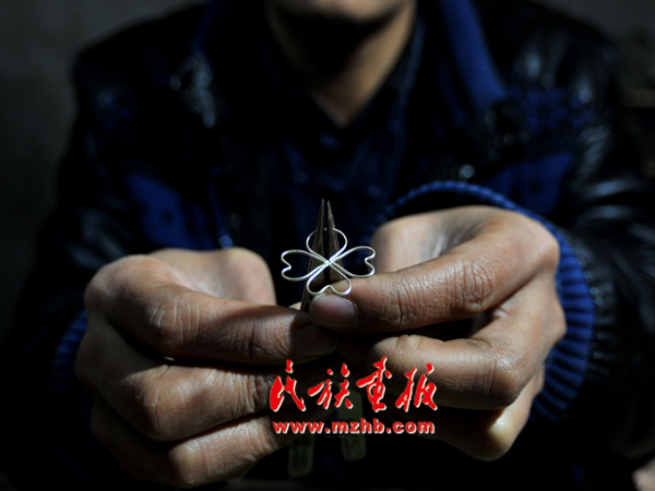 苗族银饰锻造技艺工艺流程大致包括铸炼、锤打、拉丝、搓丝、掐丝、焊接、编结、镶嵌加固、洗涤等。龙太阳在錾刻图案时并没有任何范本,工艺的精细靠的就是他心中有图,手中有数。