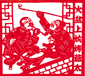 满族风情剪纸《火盆上炕烤爷太》