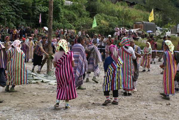 独龙族的舞蹈多为祭祀性舞蹈,均为集体舞和“纳目萨”跳的单人舞,队形只有两横排交叉和逆时针方向圆舞两种。剽牛舞是最具代表性的舞蹈,在不同的时间、场合用于不同的祭祀对象,在不同的村寨、不同的祭祀场合中,有不同的称谓。