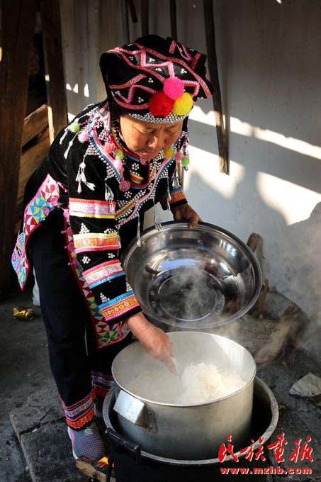 张俊波的母亲焖了一锅糯米饭,准备舂粑粑