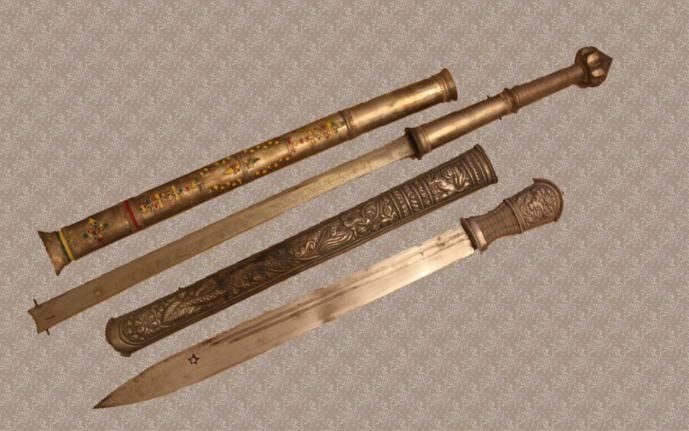 ★配刀把和刀鞘。刀把和刀鞘多用楠木加工而成,有的用铜、银皮包裹,上面雕刻装饰有各种花纹图案,如“猛虎长啸”“东山日出”“飞燕迎春”“十二属相”等,佩刀上还系有红缨背带,匕首的把多用牛角雕刻装饰而成。