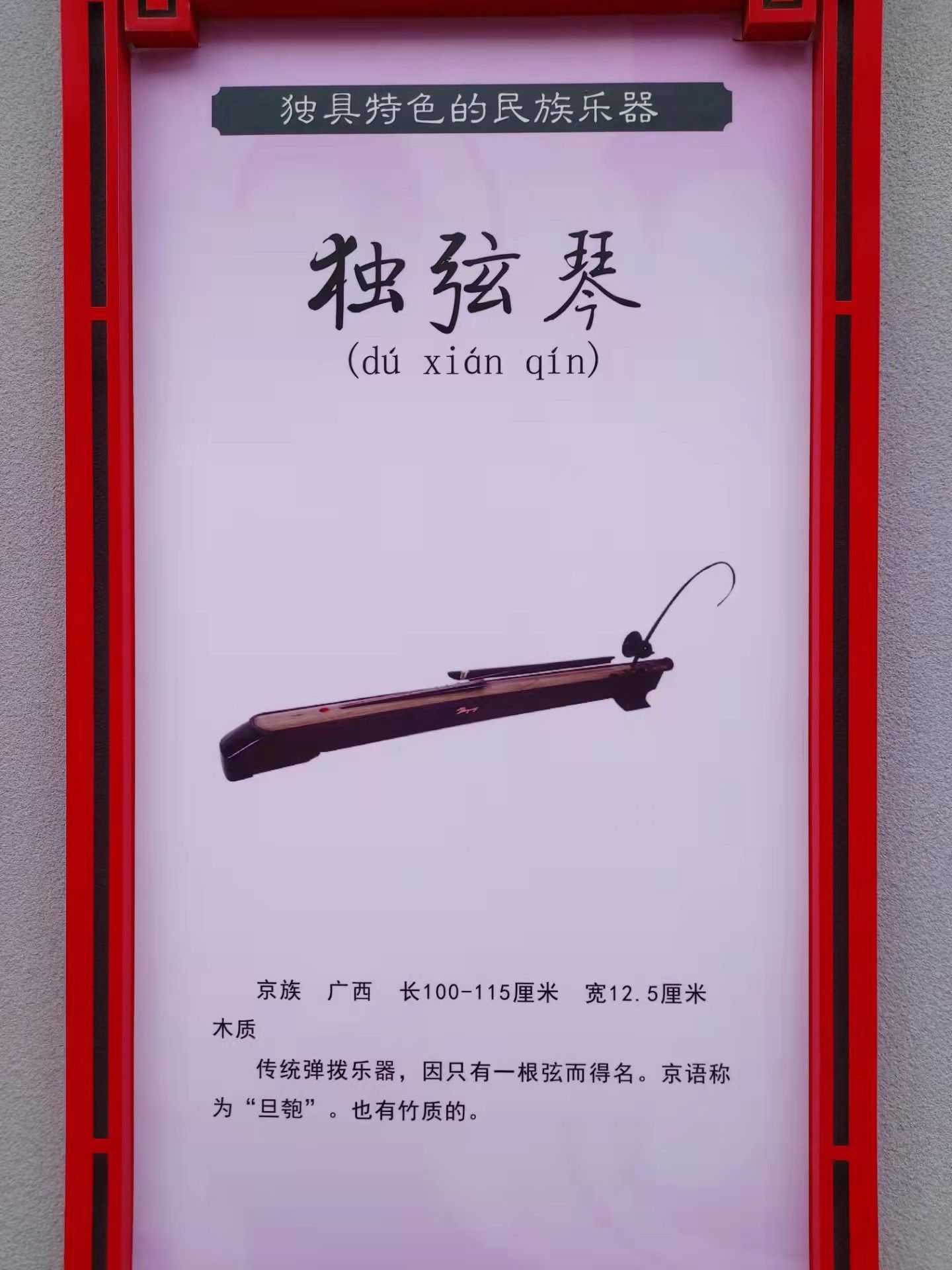 传统弹拨乐器,因只有一根弦而得名。京语称为“旦匏”。也有竹质的。
