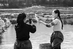 云南红河哈尼稻作梯田系统被认定为全球重要农业文化遗产。图为当地村民在梯田旁直播抓鱼。 陈欣波摄