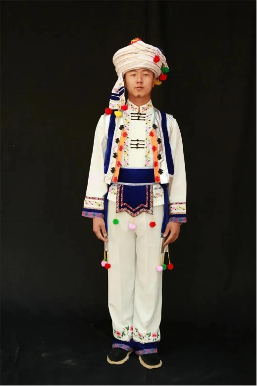 白族有着尚白的传统,白族男子喜缠白色或蓝色包头,多穿白色对襟上衣,外套黑领褂,下身穿宽筒裤,系拖须裤带,脚穿剪刀口布鞋,有的还佩带绣有美丽图案的挂包,显得敦厚英俊,洒脱大方。