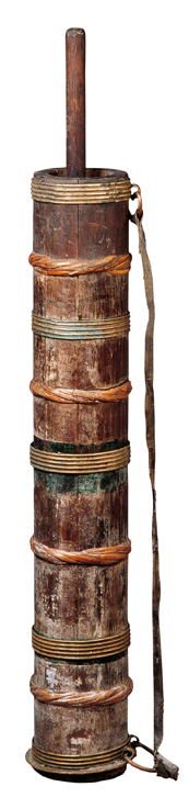 酥油茶是藏族最普遍的饮料。一日三餐、接人待客,都离不开酥油茶。酥油茶的制作各地不尽相同,西藏人打酥油茶时,先将砖茶熬成茶水滤掉茶叶,在特制的酥油桶内放适量的酥油、盐和开水,再将茶水倒入酥油桶内,然后用特制的木棒上下搅拌,直到茶水和酥油完全相溶即可。而甘青一带藏族是先将茶盛在碗里,然后加酥油,喝时一边吹碗边的油,一边喝,添数次茶水后,酥油也喝完了(图为打酥油茶桶)。