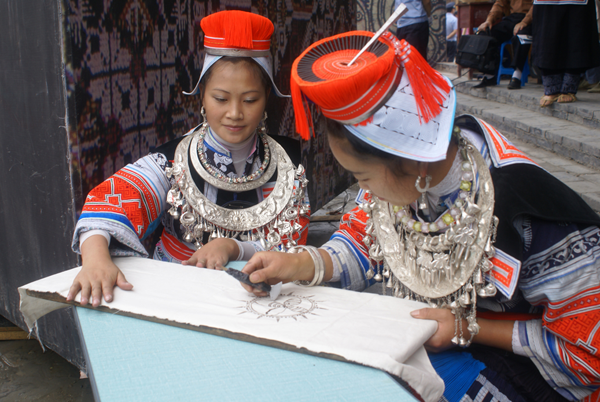 蜡染是贵州省丹寨县、安顺县、织金县苗族世代传承的传统技艺。 丹寨县、安顺县及织金县是以苗族为主体的多民族聚居区,在长期与外界隔绝的艰苦环境中,这里的居民逐渐形成了自给自足的生活方式,古老的蜡染技艺因此得以保留下来。按苗族习俗,所有的女性都有义务传承蜡染技艺,每位母亲都必须教会自己的女儿制作蜡染。所以苗族女性自幼便学习这一技艺,她们自己栽靛植棉、纺纱织布、画蜡挑秀、浸染剪裁,代代传承。在此状况下,这些苗族聚居区形成了以蜡染艺术为主导的衣饰装束(以上三照片由刘军提供)。