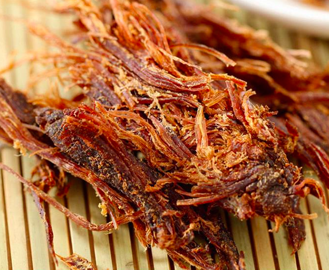 5、刮:将肉干置于木板,用一块特快的刀片,将肉干周围烧焦的部份刮干净,干巴呈金黄色。