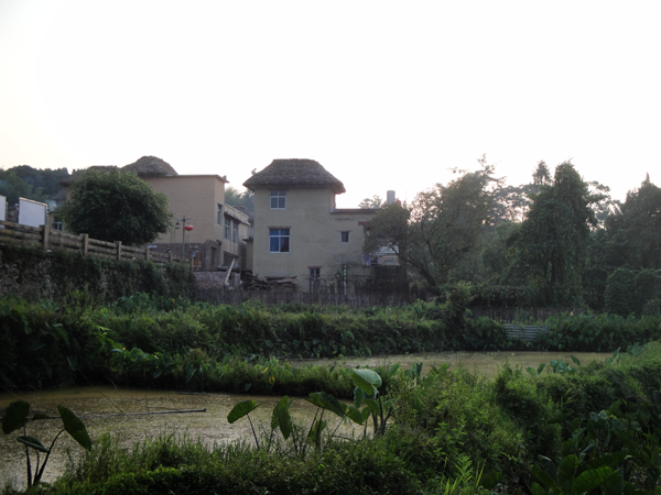 有的地方建屋顶有平顶的“土掌房”和双斜面、四斜面的茅草房。平顶房在内地和红河南岸均较普遍,其构造是在横梁上铺一层木条,上覆茅草,茅草上再铺上粘土夯实,坚硬、平整,类似水泥地面。