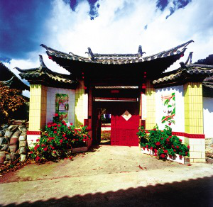 束河、沙河古村镇到处都是纳西族的田园式庭院。大门的装饰与围墙和屋脊的装饰相呼应,庭院里种了许多植物,高的果树,矮的花草,就像一个小花园,和田间弥漫着的野蔷薇都散发着令人陶醉的幽香。