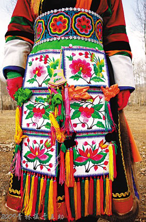2009年冬季的农历二月二,喜欢绘画的我第一次到青海省互助土族自治县拍摄土族服饰。互助土族女性的服饰让我最感兴趣,感觉是到了春季雨后的彩虹间,那样绚丽多彩而又细腻动人。土族女性服饰的袖子用红、黄、黑、绿、白等不同颜色拼成,恰似天上彩虹,因此,互助被誉为“彩虹的故乡”。在互助流传着这样一首民谚,土族阿姑(未婚女性)穿上彩虹袖,“走起路来摆三摆,蜜蜂彩蝶赶不走;拂袖跳起安召舞,恰似彩虹下凡来。”这无疑是对彩虹袖最诗意的咏叹和赞美。