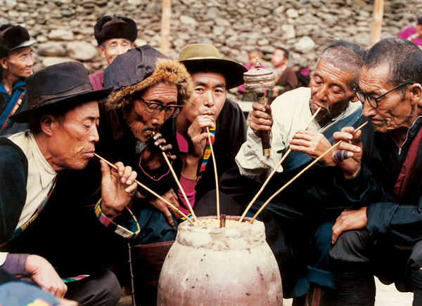 男女老少皆喜欢家酿的咂酒。青稞、大麦或玉米酿成酒,封于坛中,用时启封,注入开水,插上竹管,轮流吸咂,边饮边加清水,直至味淡。普遍吸兰花烟。
