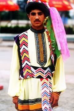 与女子的服饰一样,新郎的服饰也是抢眼的。新郎的帽子上缠红白相间的布,红色表示热烈,白色表示纯洁,红白相间,表示爱情的纯洁和忠诚。外穿绣花长“袷袢”长外衣,内穿绣花衬衣,腰间系绣花腰巾,脚登紫红色的“乔鲁克”靴,两手的无名指戴戒指。