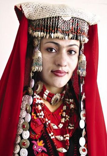 塔吉克族女子爱戴首饰,最引人注目的要数新郎和新娘的装束了。新娘的“库勒塔”帽,前缀一排银色小链子,戴长长的耳环,颈部戴几排硕大的项链。辫子上饰流苏或白扣、银元,手有手镯、戒指。新娘头上是一条长长的红色或黄色头巾,外穿红色长大衣,系红白相间的手帕。