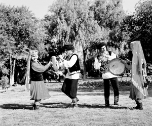 塔吉克族村民(左二、左三)在吹奏鹰笛
