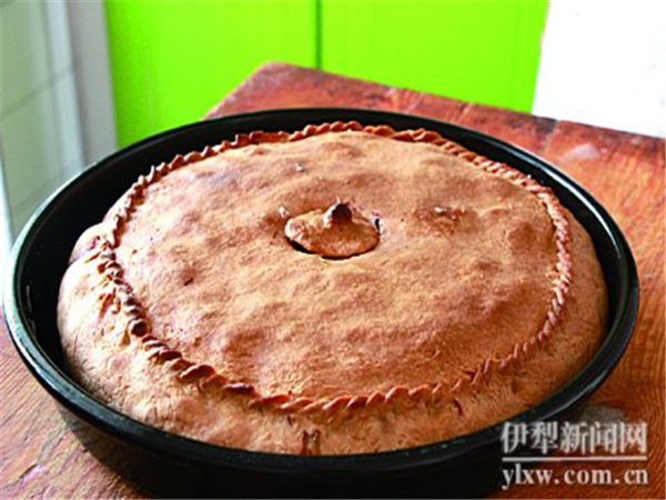 这段时间,就可以拌馅了。买斯胡旦向先前放在一旁的羊肉、土豆和洋葱中加入一些盐和黑胡椒粉,搅拌均匀。肉与黑胡椒粉相融的辛辣香味已经开始漫溢。接着继续揉面。将醒好的面分成大小两块。大的做底,小的做顶。待大小两块面都擀成圆形薄饼状后,就将底子铺在托盘底部,多出的部分紧紧扣合托盘边缘。然后倒入馅料,铺平,加盖,将上下两层面饼悉心捏合成好看的花边。最后,在面饼中间掏个洞,切下的面团做成小壶盖,再原位放到上面。壶盖的作用在于等面饼烤至表层泛红时,将其端出,取下壶盖,加些许开水进去。“拜列西很厚,里面的料很多,要是水干了,就不容易熟。”买斯胡旦解释。做完这一切,就可以将托盘放进烤箱了,调整烤箱至200℃的火力就够,这样,经过2个小时的烘烤,外酥内软,香而不焦的拜列西就烤好了。