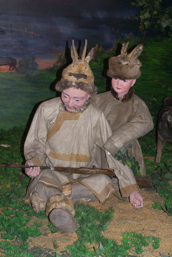 狩猎经济在鄂伦春族社会中维持了几千年,一人一匹猎马一杆枪,再加上几条猎狗和一片猎场,几乎就是鄂伦春族的全部生产力。而枪支的传入也不过才300多年的历史,在此之前使用石块和木棒狩猎,后来发明了扎枪和弓箭,与外界几乎隔绝,纯粹的食兽肉、衣兽皮。鄂伦春族最早使用的猎枪是被称做“俄罗斯鸟枪”的火枪,这是清朝的察边官吏、外民族及俄国商人交换给他们的。有火绳枪、火镰枪和泡子枪三种,都是从枪筒装入火药或铅弹,只是引爆方式不同。民国以后陆续传入俄国造的连珠式和“三八”式、“七九”式等现代步枪。枪支的传入,使鄂伦春人有了剩余产品,于是出现了交换经济。每年五月的“楚勒罕”集会时,鄂伦春、鄂温克、达斡尔等狩猎民族要向清廷贡貂,经朝廷官员检验,不合格者可以在集会上进行互市。此时,他们也带一些其他的猎产品及手工艺品进行交换。由于鄂伦春人所贡貂皮质量最好,故朝廷对他们采取了特别的纳貂办法:每年派一名专职人员到鄂伦春地区代表官府征收貂皮、发放赏赐。这些专职人员被称为“谙达”,他们代表官府征收貂皮的同时,也自带一些粮食、布匹和其他生产、生活用品与鄂伦春人进行私下交换。后来,“谙达”变成了泛指进山进行猎产品收购生意的所有商人。“谙达”与鄂伦春人进行交换时从不计价,而是以“马驮”为计量单位,双方以同样一马驮的物品进行互换,或者采取包干制的办法,一个“谙达”固定几个包揽户,按期供给他们生产和生活必需品,包揽户将所有的剩余产品交于“谙达”。随着货币经济的发展,清末时期,鄂伦春族周边地区出现了众多商号商铺,这些商号(铺)的老板被称为“老客”,他们同鄂伦春人进行计价交换。同时还出现了一些进行计价交换的行商,被称为“跑老客”。鄂伦春人虽然受到“谙达”、老客和跑老客的疯狂欺诈和层层盘剥,但在与他们的交换中,却自觉或不自觉地打开了封闭的自然经济大门,朝着商品经济迈进了一步(鄂伦春博物馆展览摄影:刘军)。