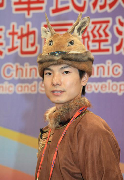 游猎时期鄂伦春人的服饰基本都是用兽皮制作的。用兽皮缝制衣服,首先要熟化兽皮,先把皮子晒干,将煮熟的狍肝捣烂,涂抹在皮板上再喷一些水,包好闷几天,使皮板变软。熟皮子时坐在地上,用双脚夹住皮子的一角,先用“克得热”(约二尺长的弧形带锯齿刮具)反复刮揉,待皮膜和污垢暴起,再用“毛担”(又称“毛贺得勒”,约二尺长的弧形钝刃刮刀)刮掉,就这样反复揉刮,直至皮板柔软且富有弹性为止。最后,几个人配合,将柔软的皮张放在朽木火上,一边熏烤一边均力拉伸,皮张就变得平平展展了(右图为鄂伦春传统服饰,头戴狍头帽,刘军供图)。