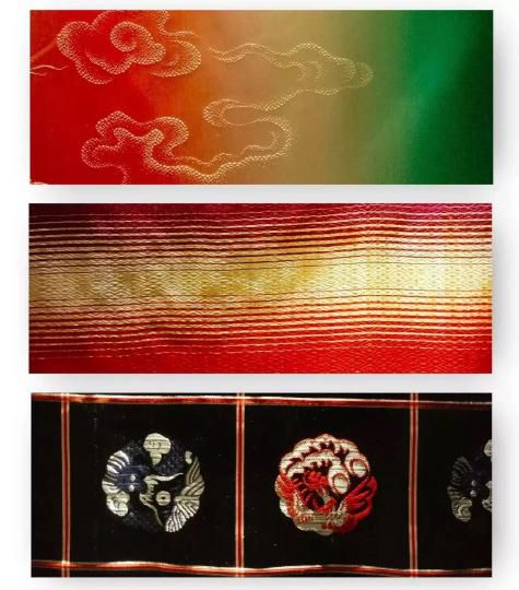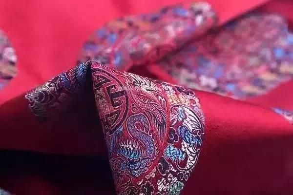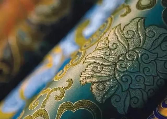 民族锦一般采用多色彩条嵌入金银丝织成,多用于民族服饰,故名。其特点是锦面上的图案从经纬线交织中显现出自然光彩,富有光泽。常见的图案有团花、葵花、“万”字“寿”字等。彩晕锦的特点是织纹华贵相映,明暗匹配,层次分明,并以色晕过渡,花纹绚丽多彩,别具一格。